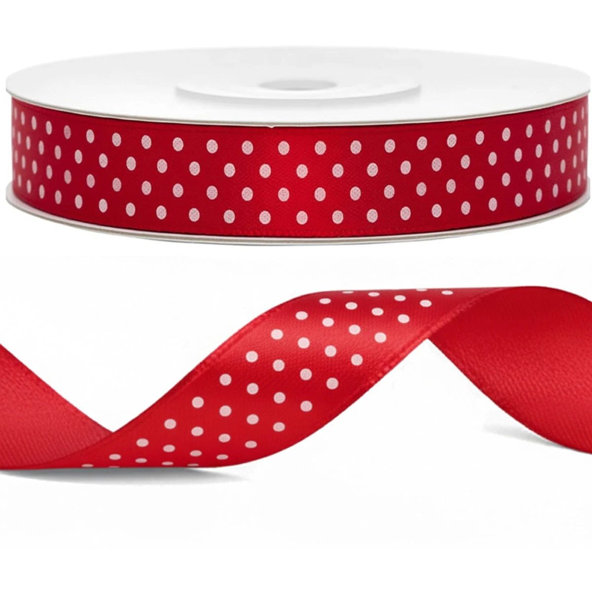- Czerwona w białe kropki tasiemka satynowa o szerokości 12 mm i długości aż 25 metrów to wszechstronny dodatek dekoracyjny, który sprawdzi się w domu, kwiaciarni, pracowni artystycznej oraz przy organizacji imprez okolicznościowych.