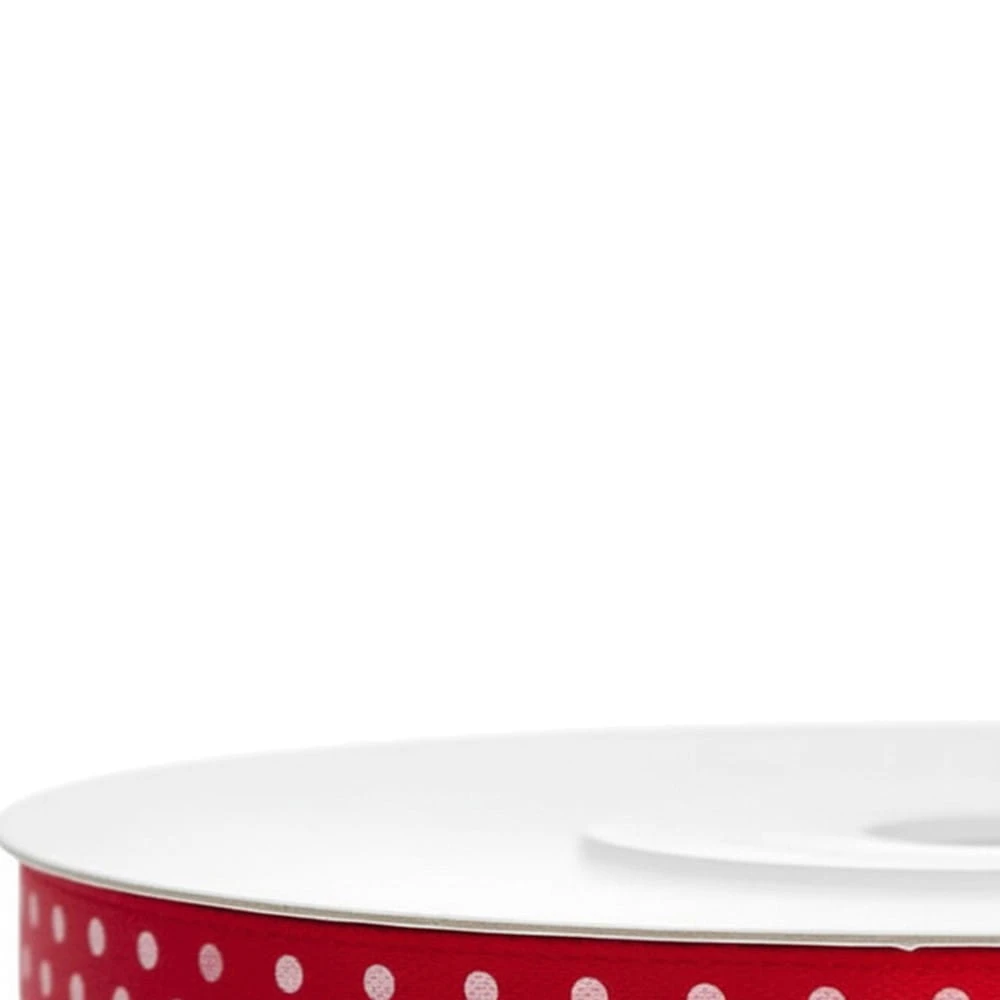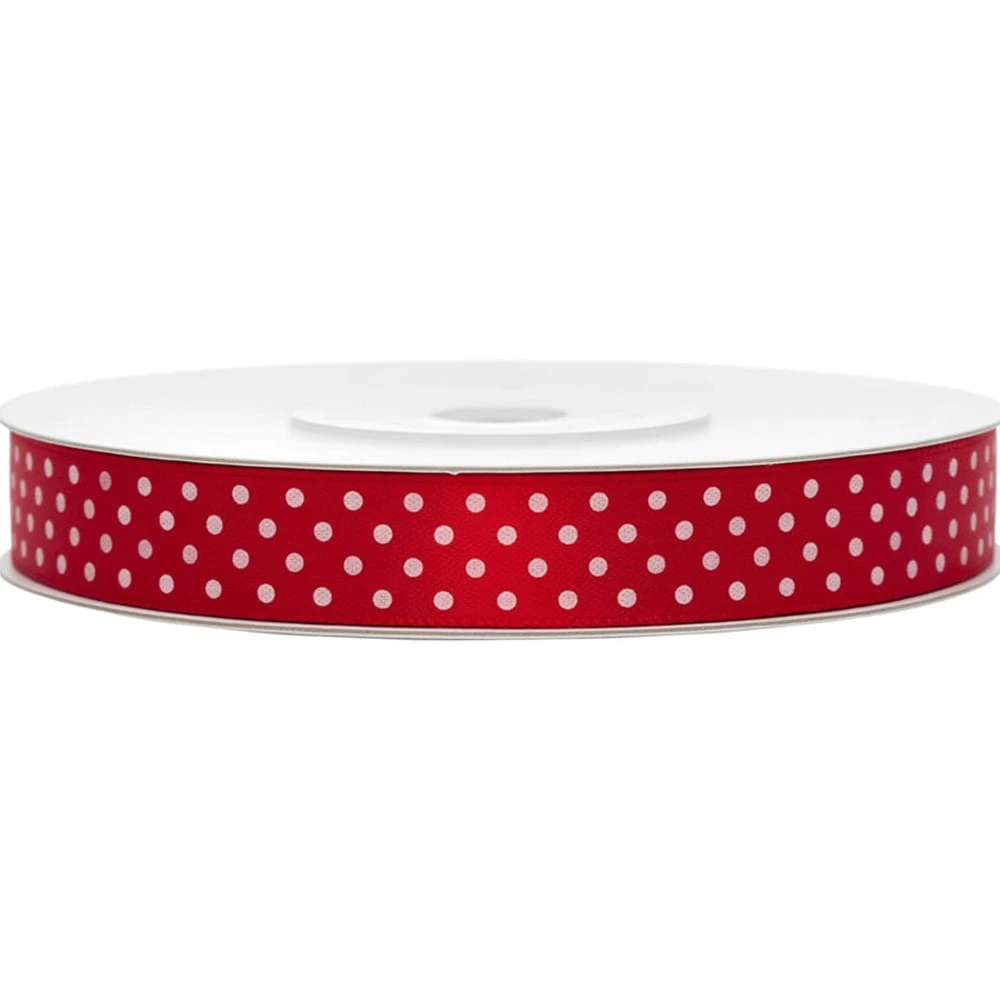 ✔️Tasiemka satynowa "Gładka", czerwona w białe kropki, PartyDeco, 12 mm x 25 m